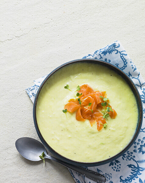 Leek soup with smoked salmon topping