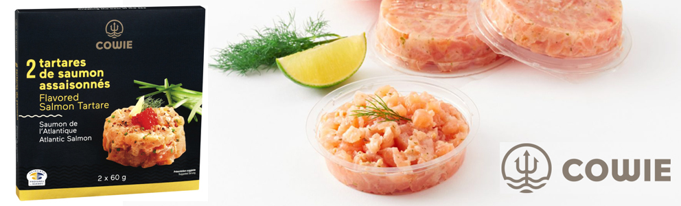 Cowie offers a 2 servings package of Atlantic salmon tartare, seasoned and frozen. It is prepared with mustard caviar, chilli, jalapenos, dill, lemon and other seasonings. Ready-to-serve, you can add your personal touch with a special topping and homemade croutons.