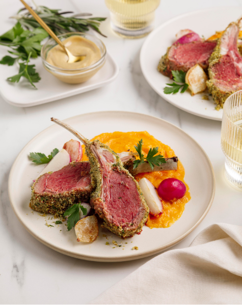 Carrés d’agneau en croûte de fines herbes et purée de courge de saison au beurre noisette – une recette 100% biologique.
