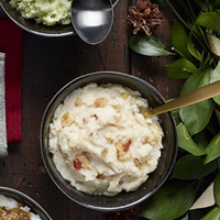 Pour 250 g (approx. 1 tasse) de purée, ajouter 60 g (1/4 tasse) de dés de pomme sautés dans le beurre avec un peu d'échalote grise finement hachée. Puis ajouter à la purée du cheddar fort râpé au goût.