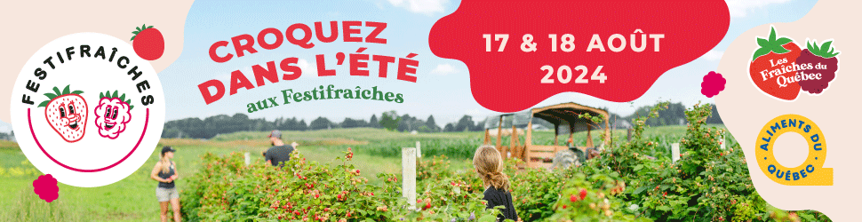 Les 17 et18 août prochains, une douzaine de fermes, réparties dans plusieurs régions de la province, ouvrent leurs portes pour accueillir les amoureux des « Fraîches » du Québec. De la Capitale-Nationale à la Gaspésie, de la Montérégie au Saguenay-Lac-Saint-Jean, « Festifraîches » est le plus gros party de fraises et framboises du Québec. L'idée est simple : la saison des petits fruits n'est pas terminée, les fraises d'automne sont une variété qui gagne à être célébrée. Que ce soit en famille, en épicerie ou en cuisine, c’est le moment de faire la fête aux petits fruits d’ici.