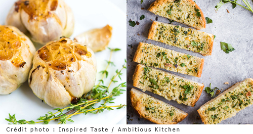 - Couper le dessus des têtes d'ail et les badigeonner d'huile d'olive. Saler. Déposer les têtes d’ail sur une plaque et cuire pendant 45 minutes.