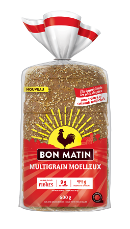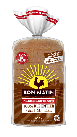 C’est un fait : il n’y a jamais trop de blé entier. C’est pourquoi Bon Matin réinvente le format de leur pain 100 % Blé entier, passant de 400 g à 600 g. Un petit 200 g supplémentaire qui se prend bien! Il constitue une source de fibres avec 4 g de fibres et 50 g de grains entiers par portion de 2 tranches.