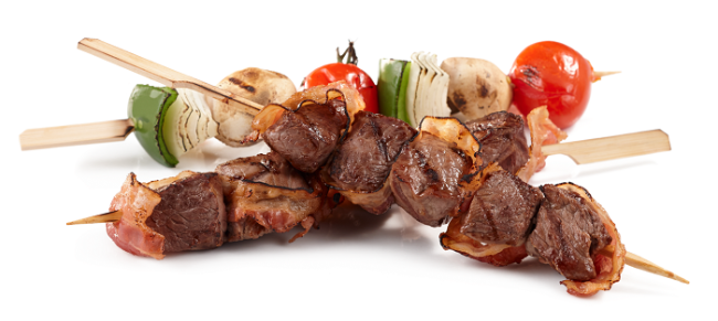 - Pour la cuisson, enfiler sur les brochettes l’agneau et le bacon afin que le bacon se superpose aux cubes d’agneau. Réserver le reste de la marinade.