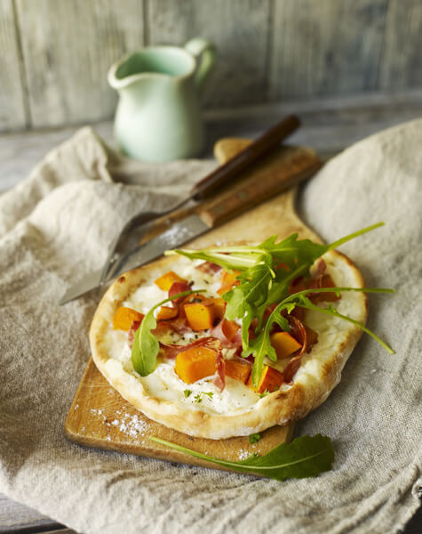 Mini pizza à la courge, bacon et roquette