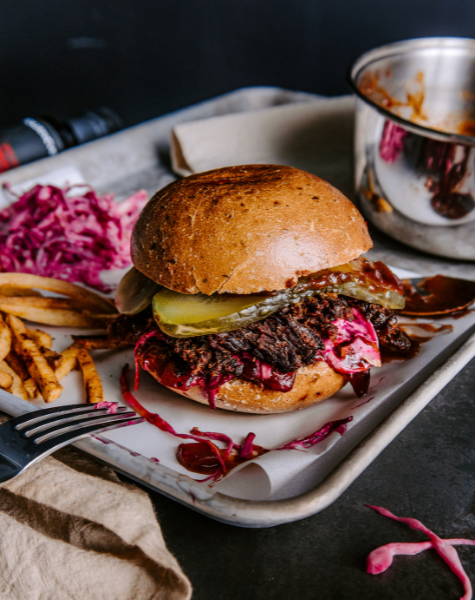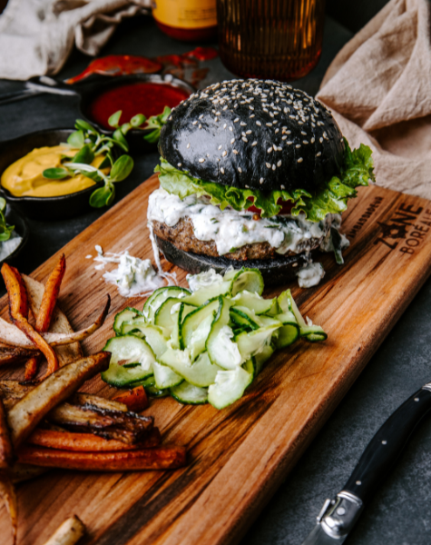 Hambourgeois d’agneau, tzatziki maison et frites aux légumes aux épices boréales du restaurant Le Baumier
